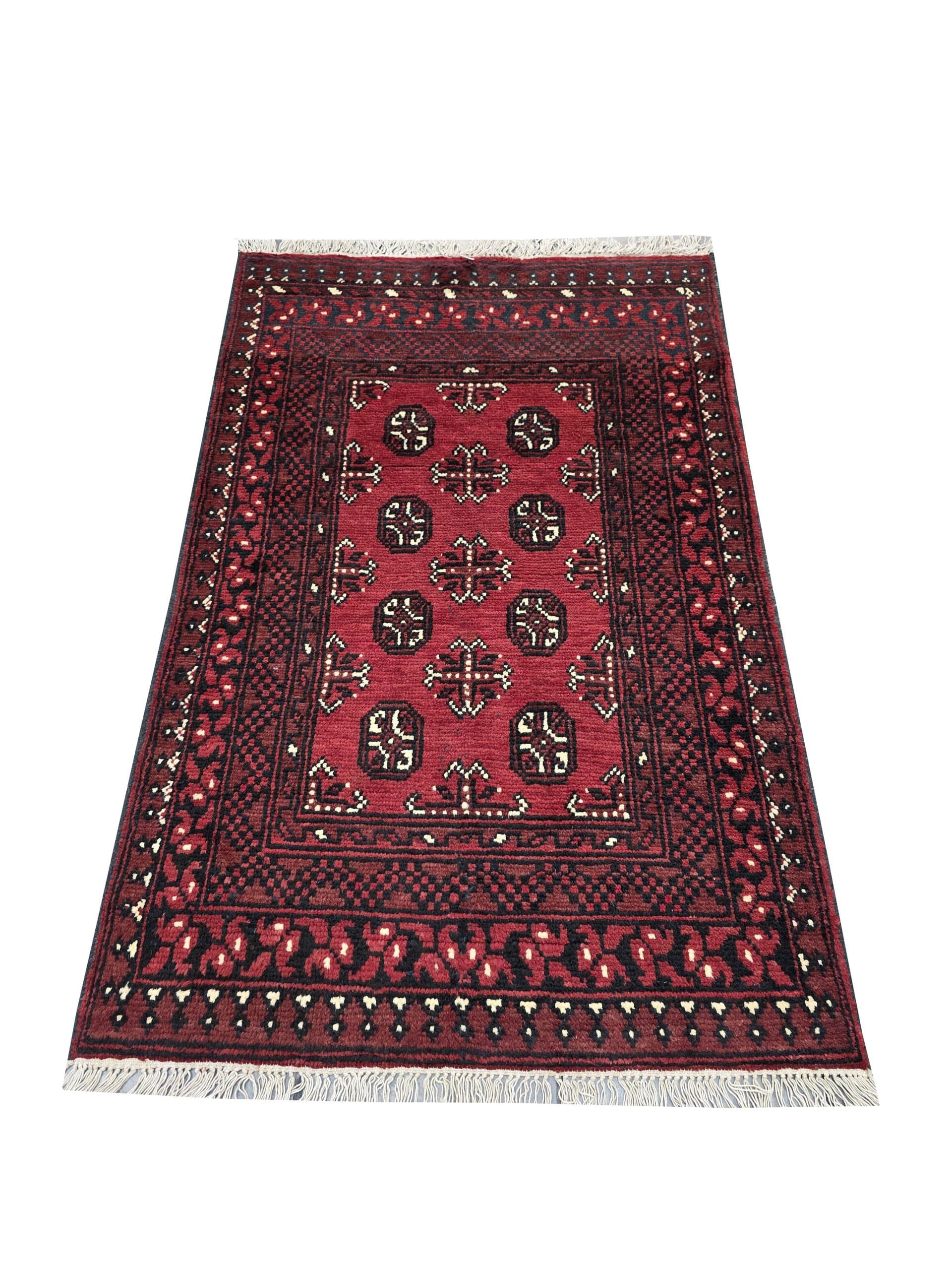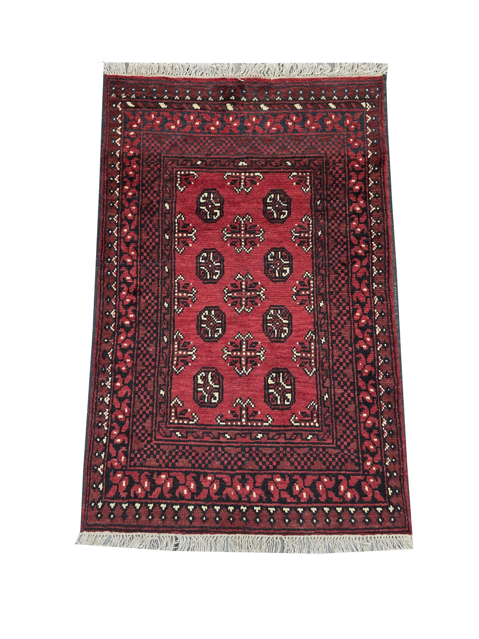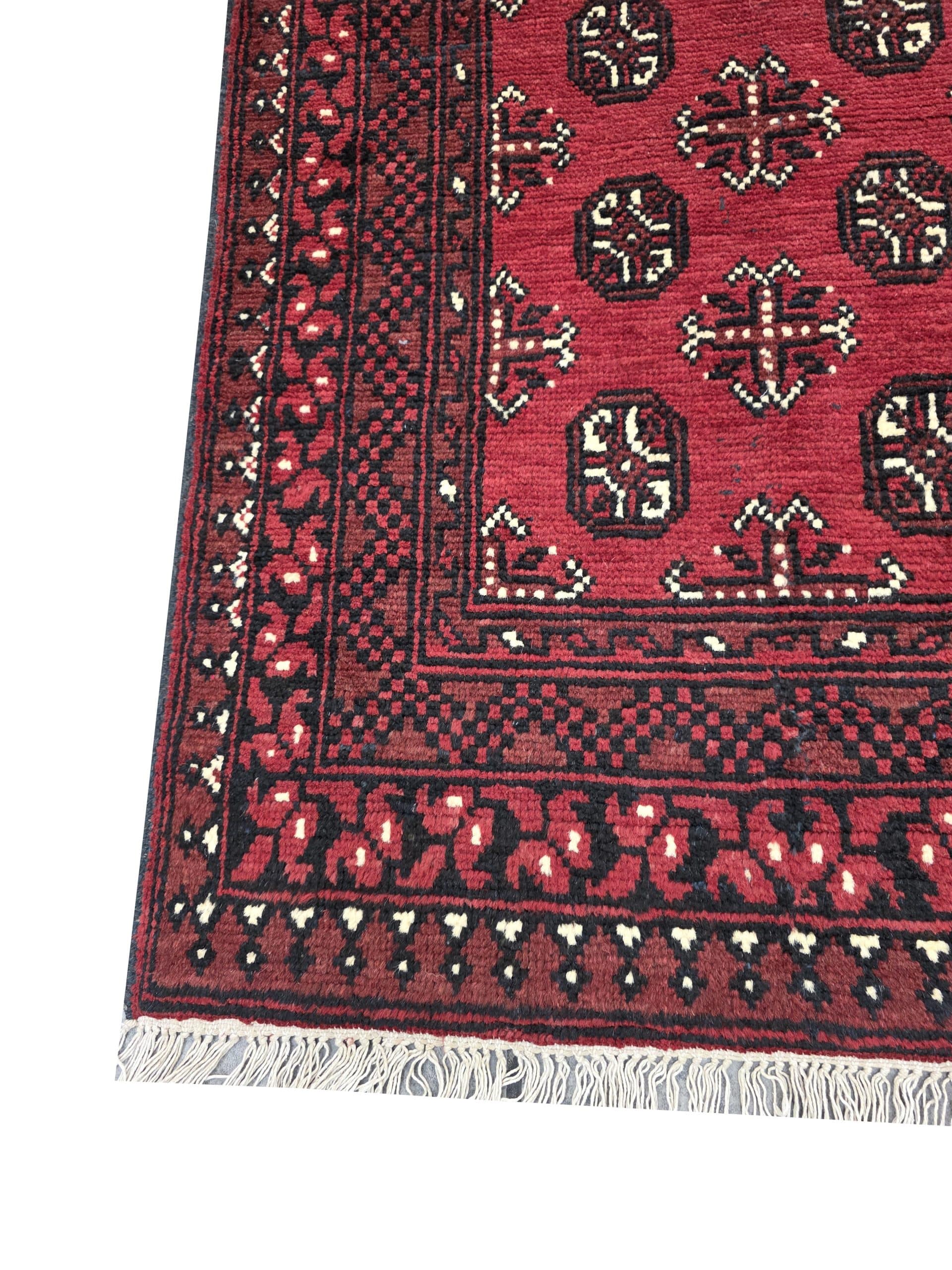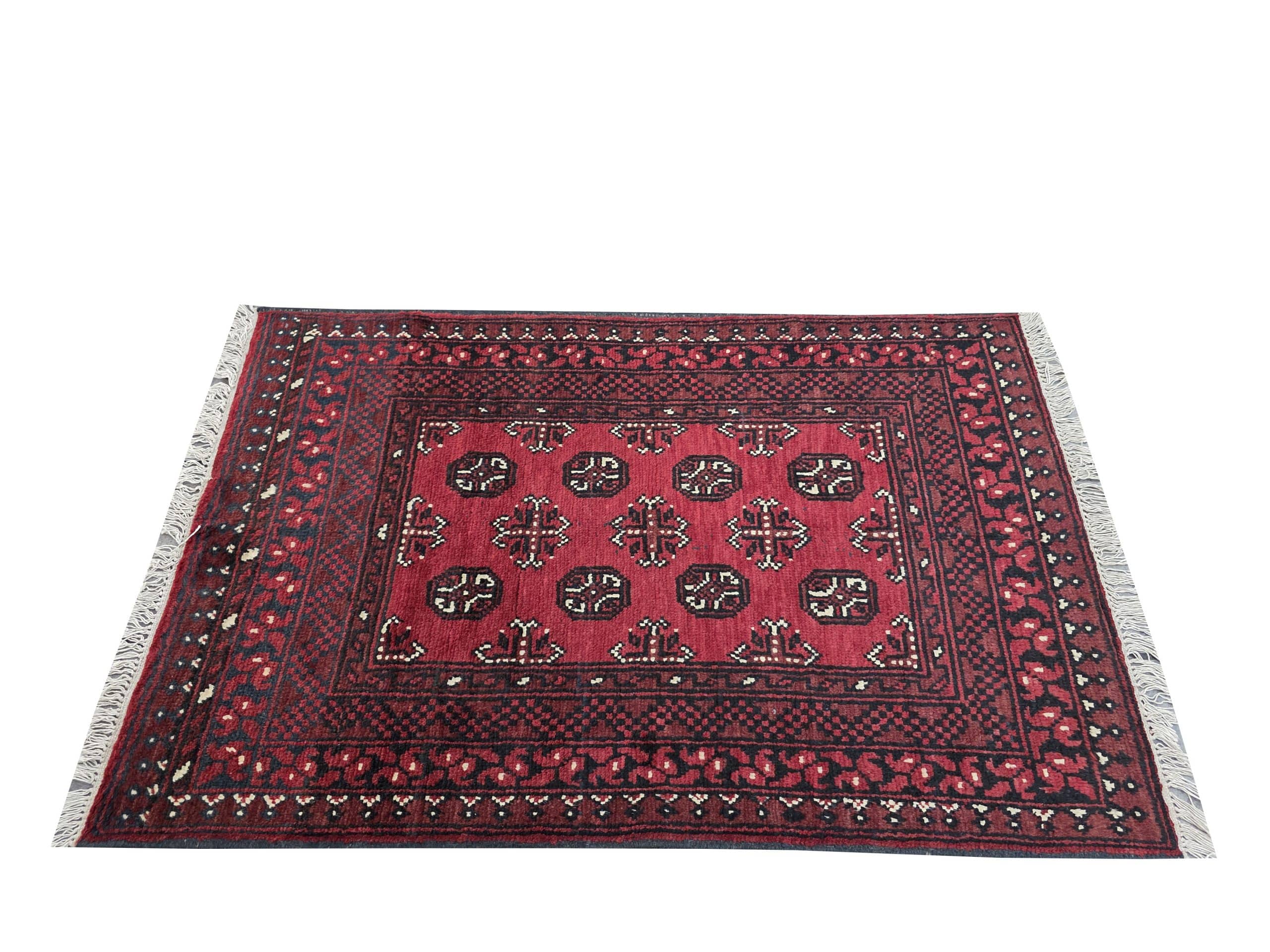- Red Afghan or Aqcha rugs are simple verision of the Khal Mohammadi rug design. Using locally sourced wool and chemical dyes, the Afghan Reds have a lower knot count than their Khal Mohammadi counterparts and are less introcate as a result. They are woven around the Aq Chah region and between Ankoy and Mazar-i-Sharif in northern Afghanistan. Aqchas are excellent value for money for those looking for a nice handknotted rug that won’t break the bank.Afghan Reds are warm and welcoming. The colours are dark, usually deep reds with dark blue or black used for detail. The detail in the rug can vary but the pattern is almost always one form of repeated columns of ‘gul’ or ‘fil pai’ (elephant prints) adapted from the Ersari and Turkmen weavers’ heritage.