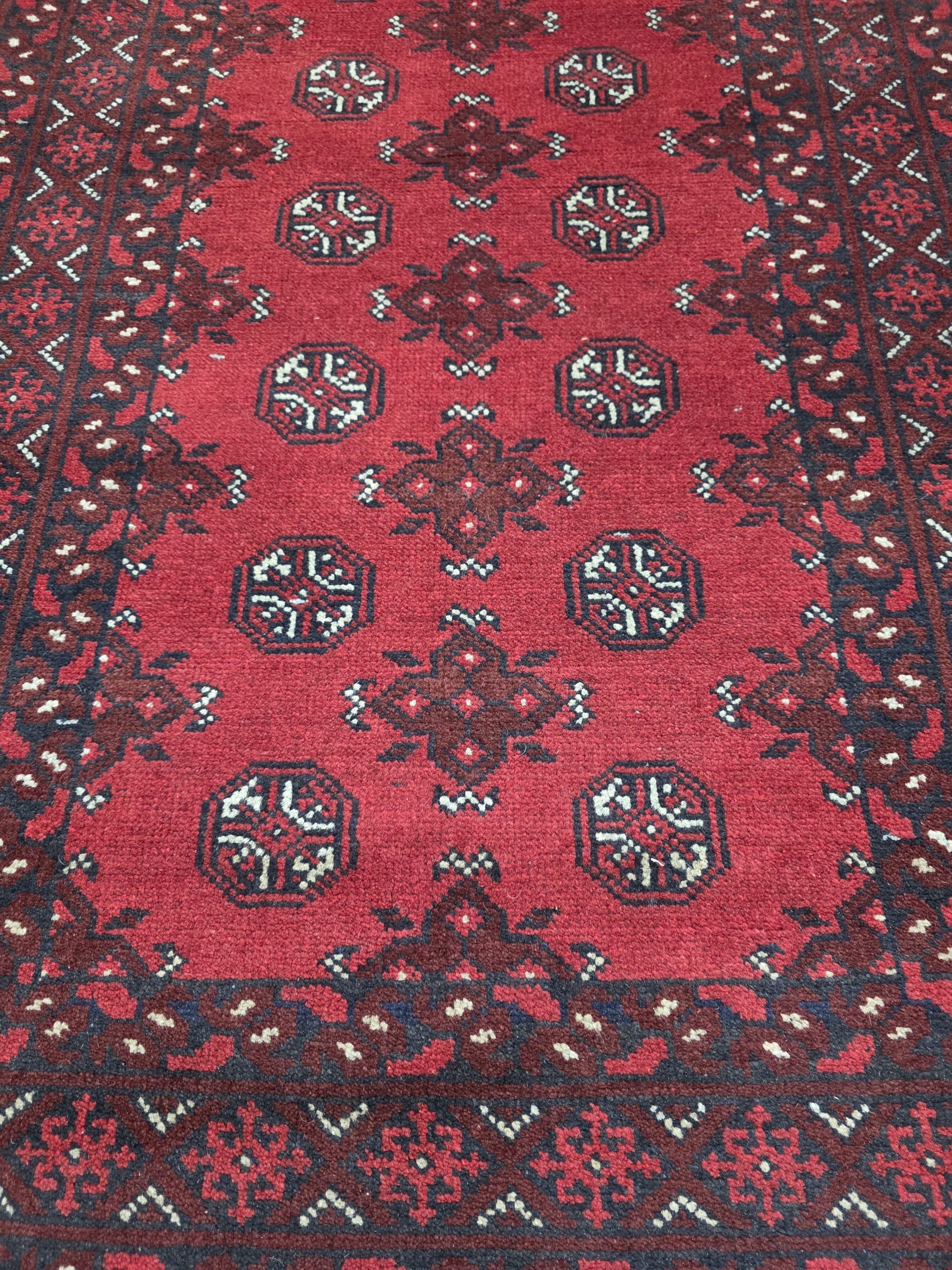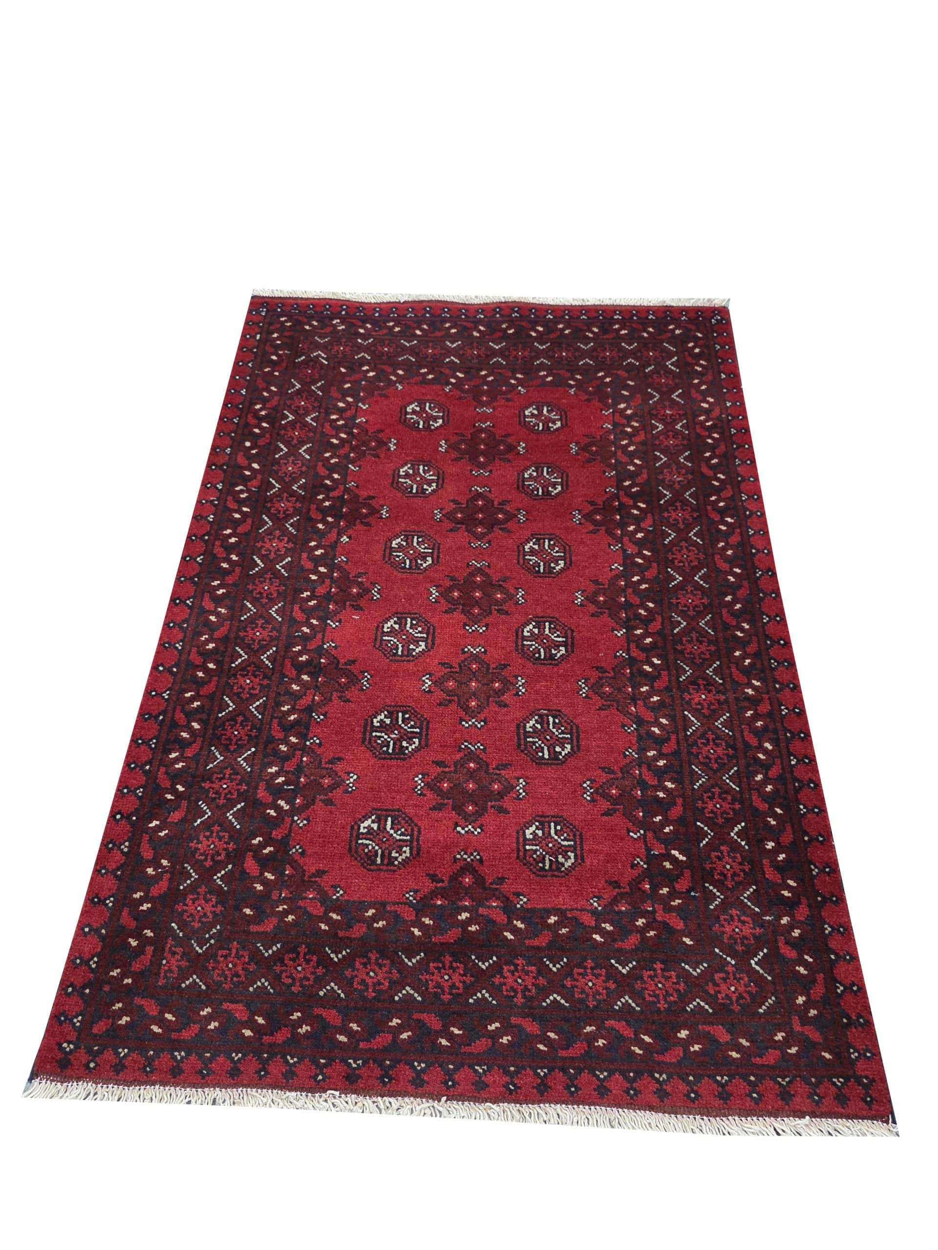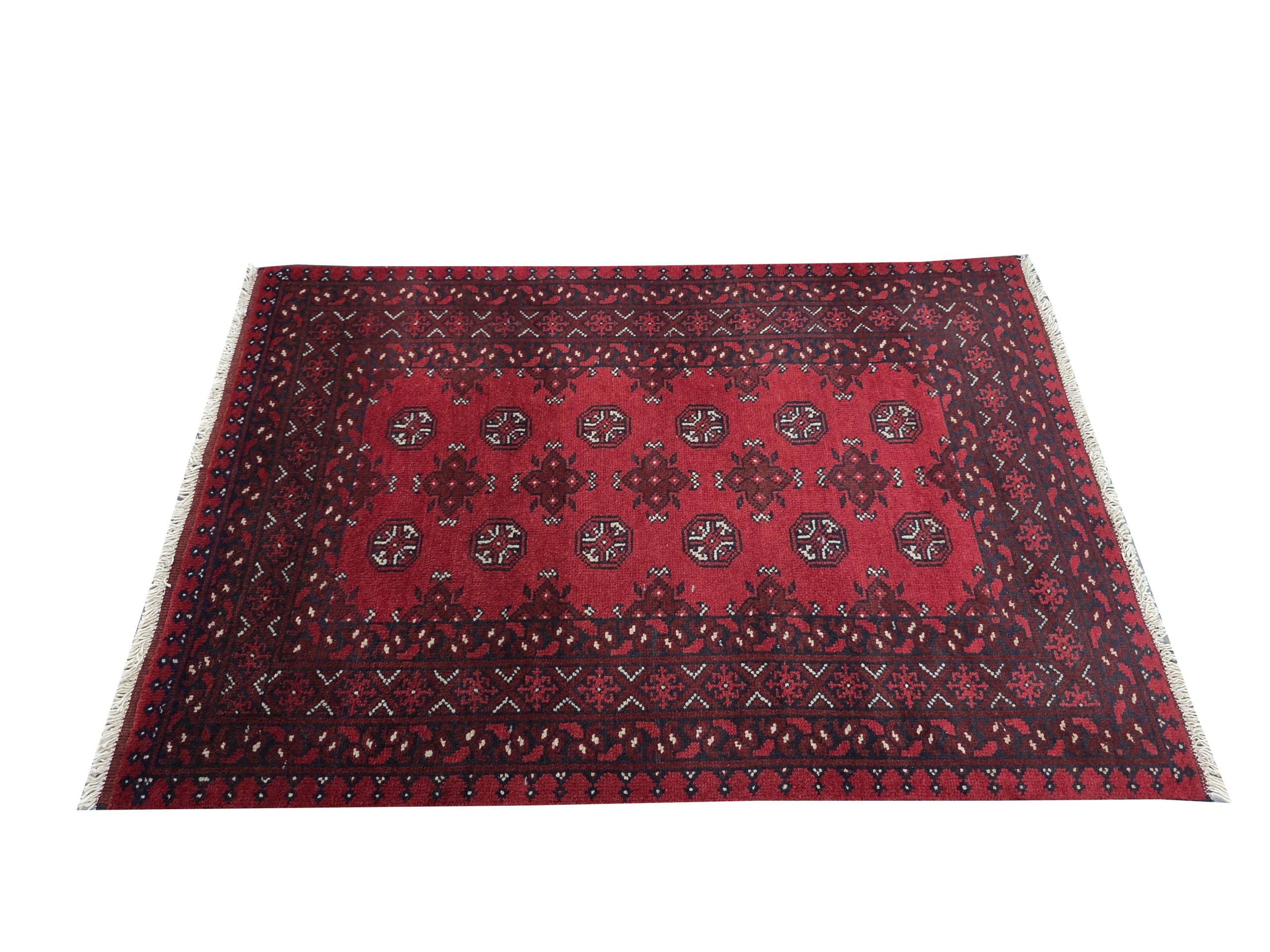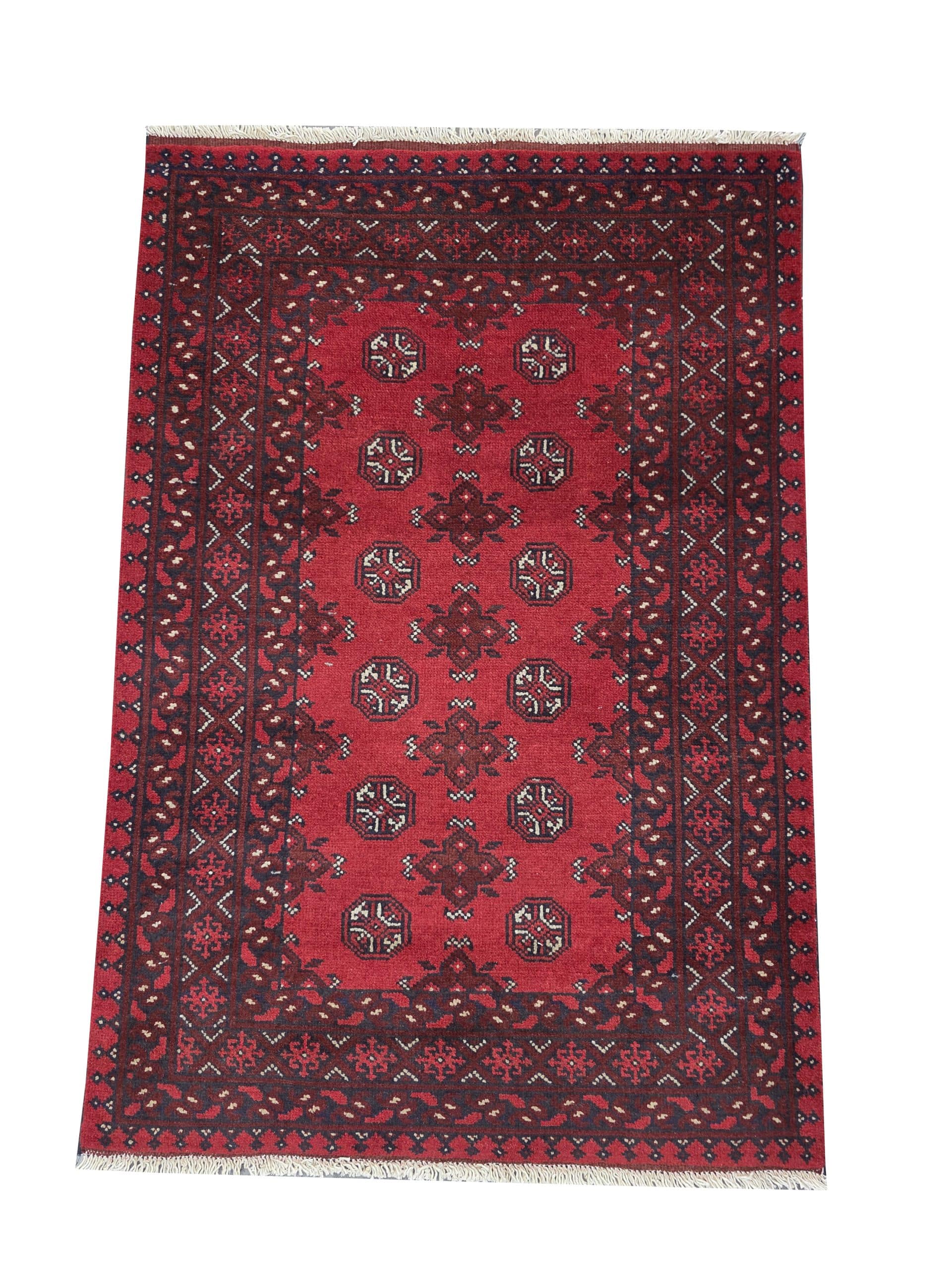 - Red Afghan or Aqcha rugs are simple verision of the Khal Mohammadi rug design. Using locally sourced wool and chemical dyes, the Afghan Reds have a lower knot count than their Khal Mohammadi counterparts and are less introcate as a result. They are woven around the Aq Chah region and between Ankoy and Mazar-i-Sharif in northern Afghanistan. Aqchas are excellent value for money for those looking for a nice handknotted rug that won’t break the bank.Afghan Reds are warm and welcoming. The colours are dark, usually deep reds with dark blue or black used for detail. The detail in the rug can vary but the pattern is almost always one form of repeated columns of ‘gul’ or ‘fil pai’ (elephant prints) adapted from the Ersari and Turkmen weavers’ heritage.