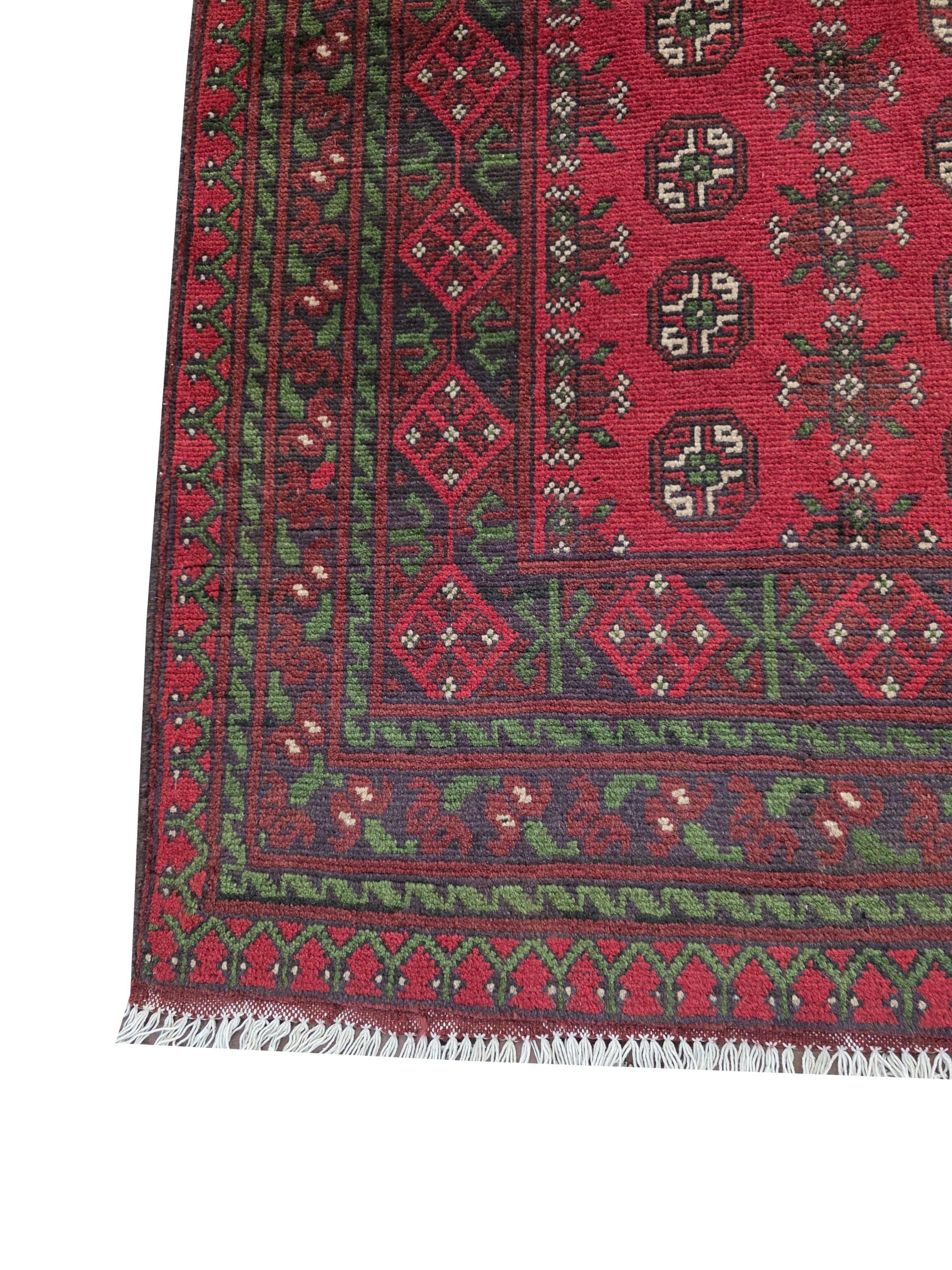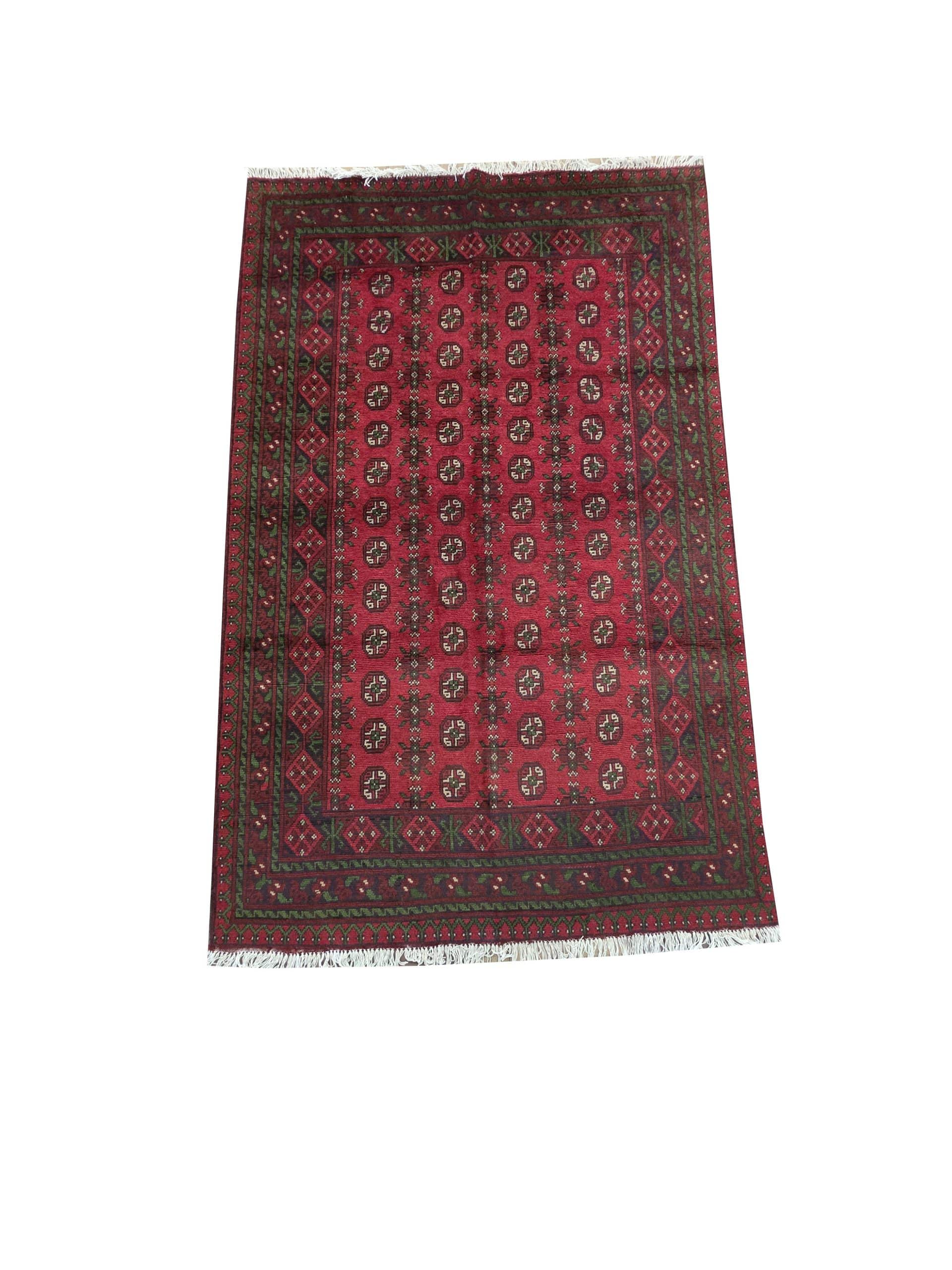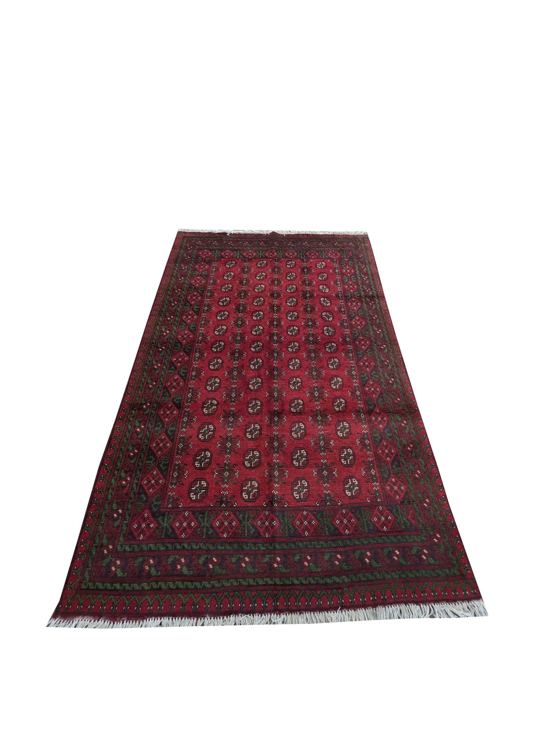 • Red Afghan or Aqcha rugs are simple verision of the Khal Mohammadi rug design. Using locally sourced wool and chemical dyes, the Afghan Reds have a lower knot count than their Khal Mohammadi counterparts and are less introcate as a result. They are woven around the Aq Chah region and between Ankoy and Mazar-i-Sharif in northern Afghanistan. Aqchas are excellent value for money for those looking for a nice handknotted rug that won’t break the bank.Afghan Reds are warm and welcoming. The colours are dark, usually deep reds with dark blue or black used for detail. The detail in the rug can vary but the pattern is almost always one form of repeated columns of ‘gul’ or ‘fil pai’ (elephant prints) adapted from the Ersari and Turkmen weavers’ heritage.