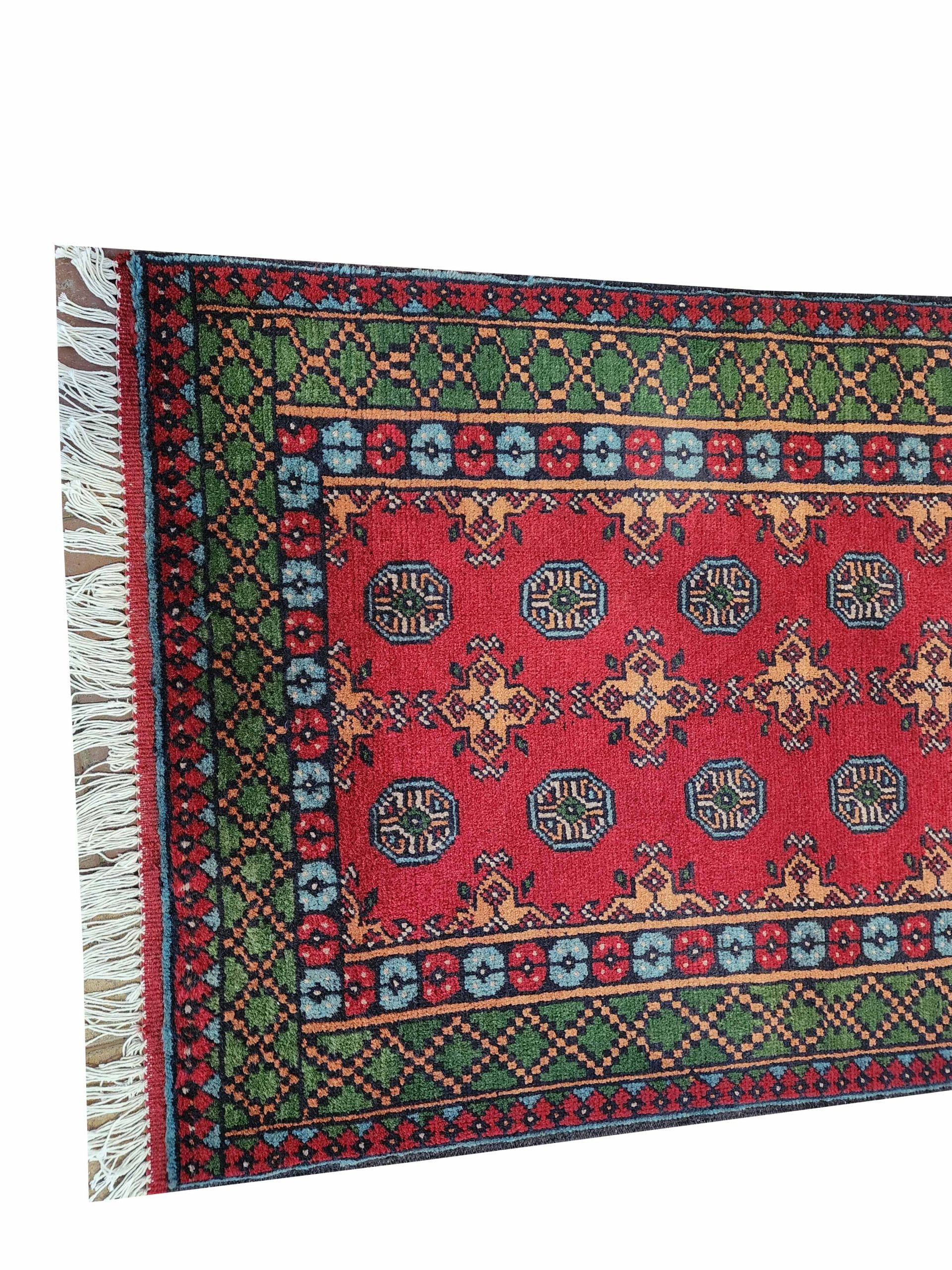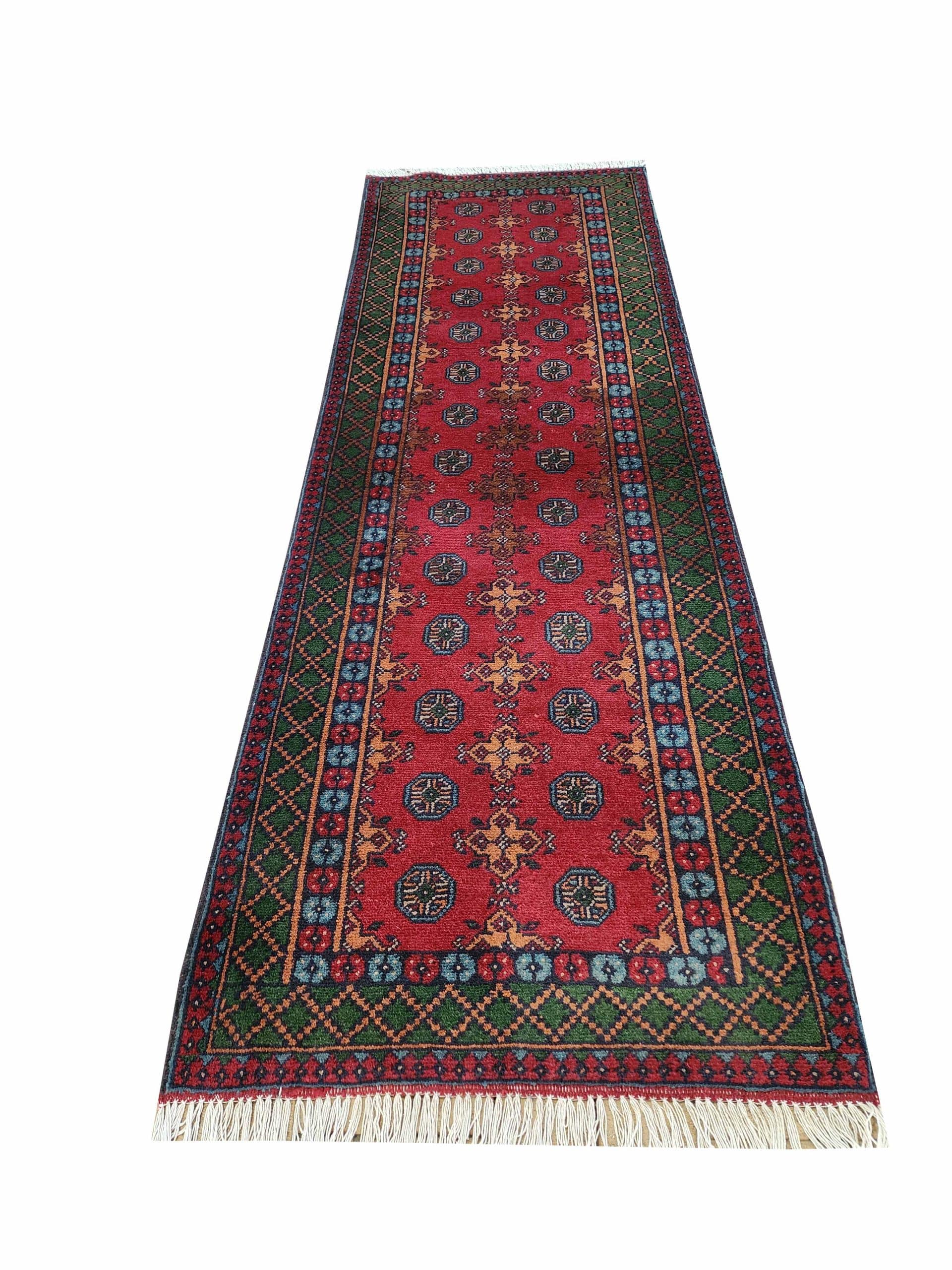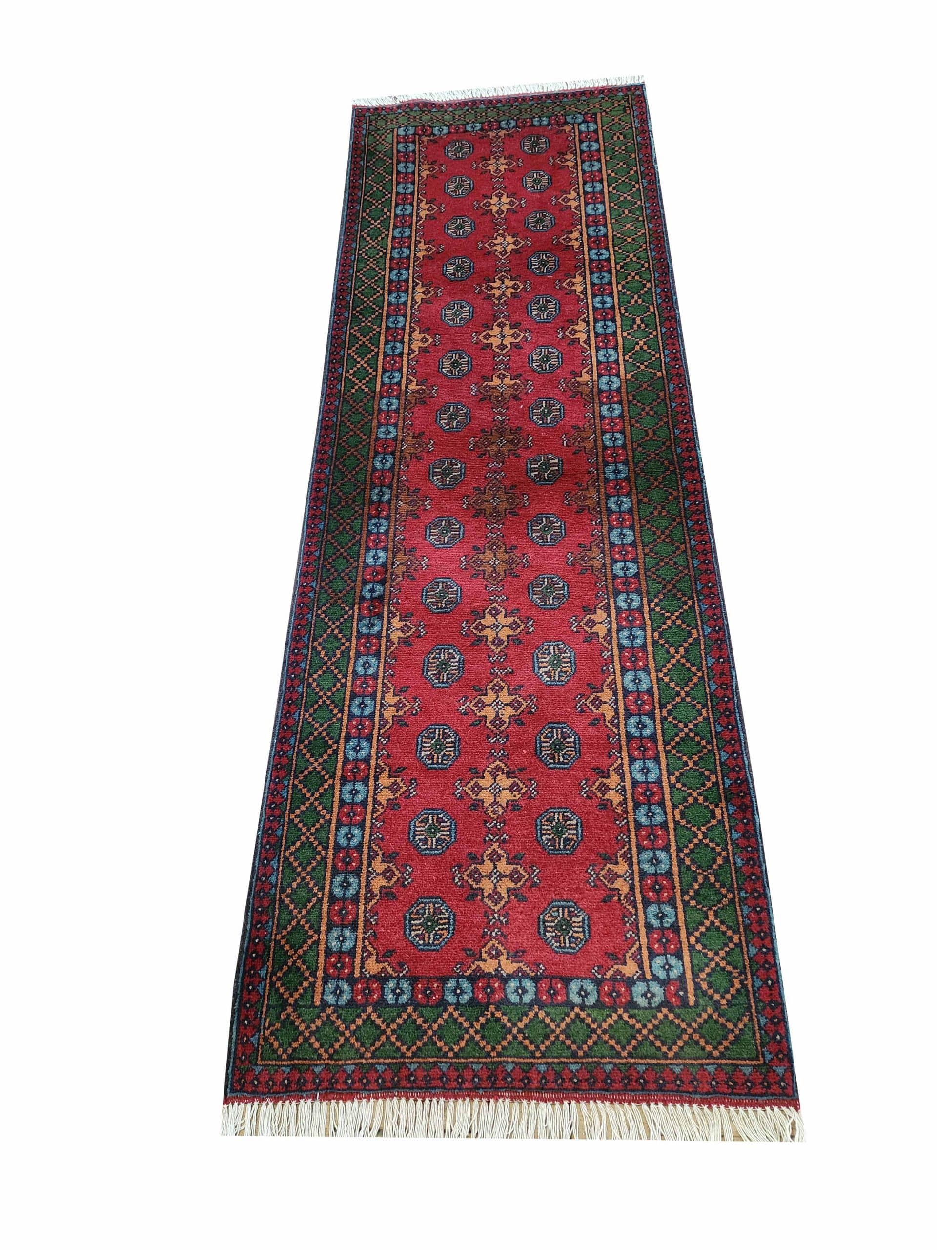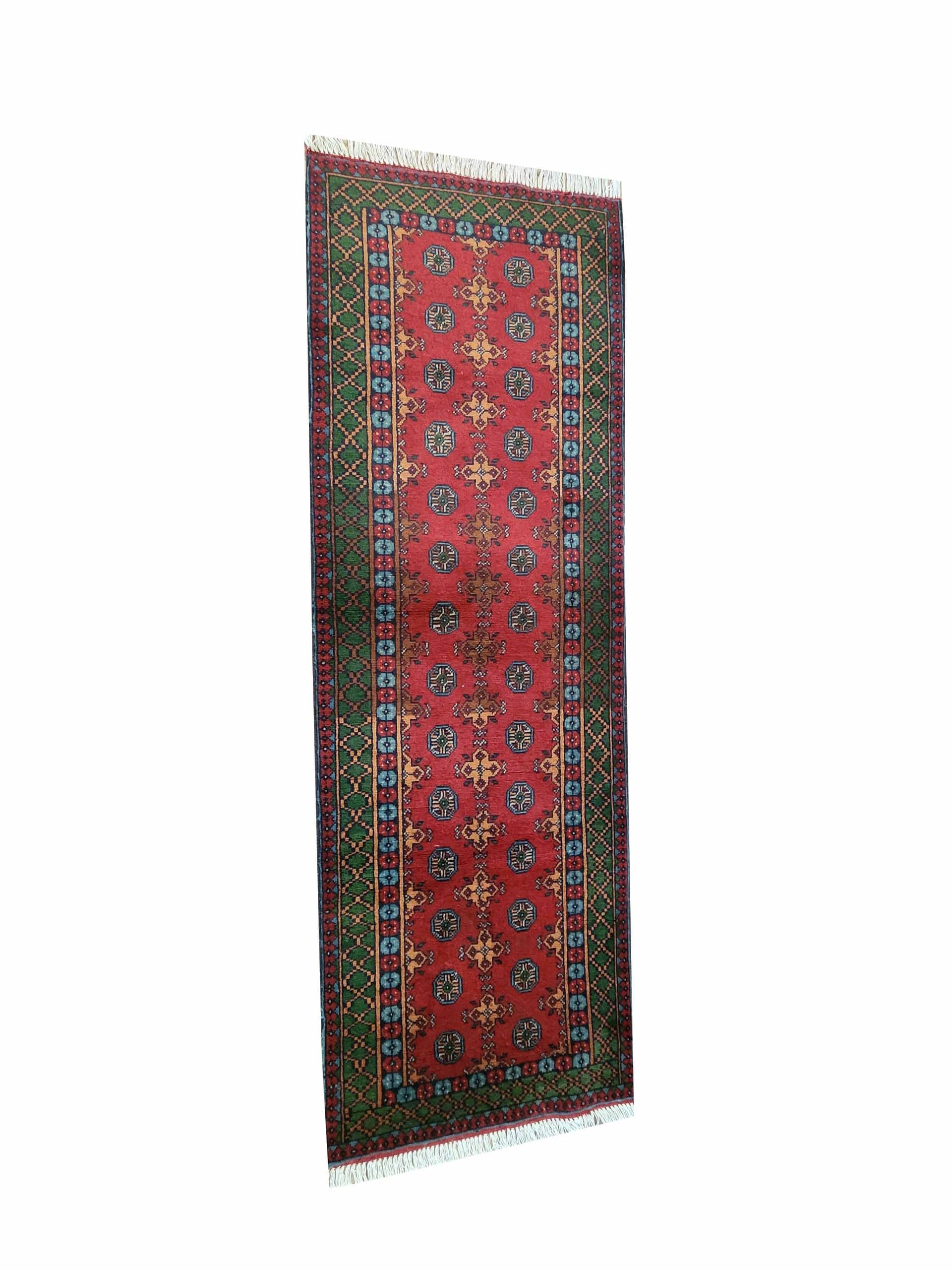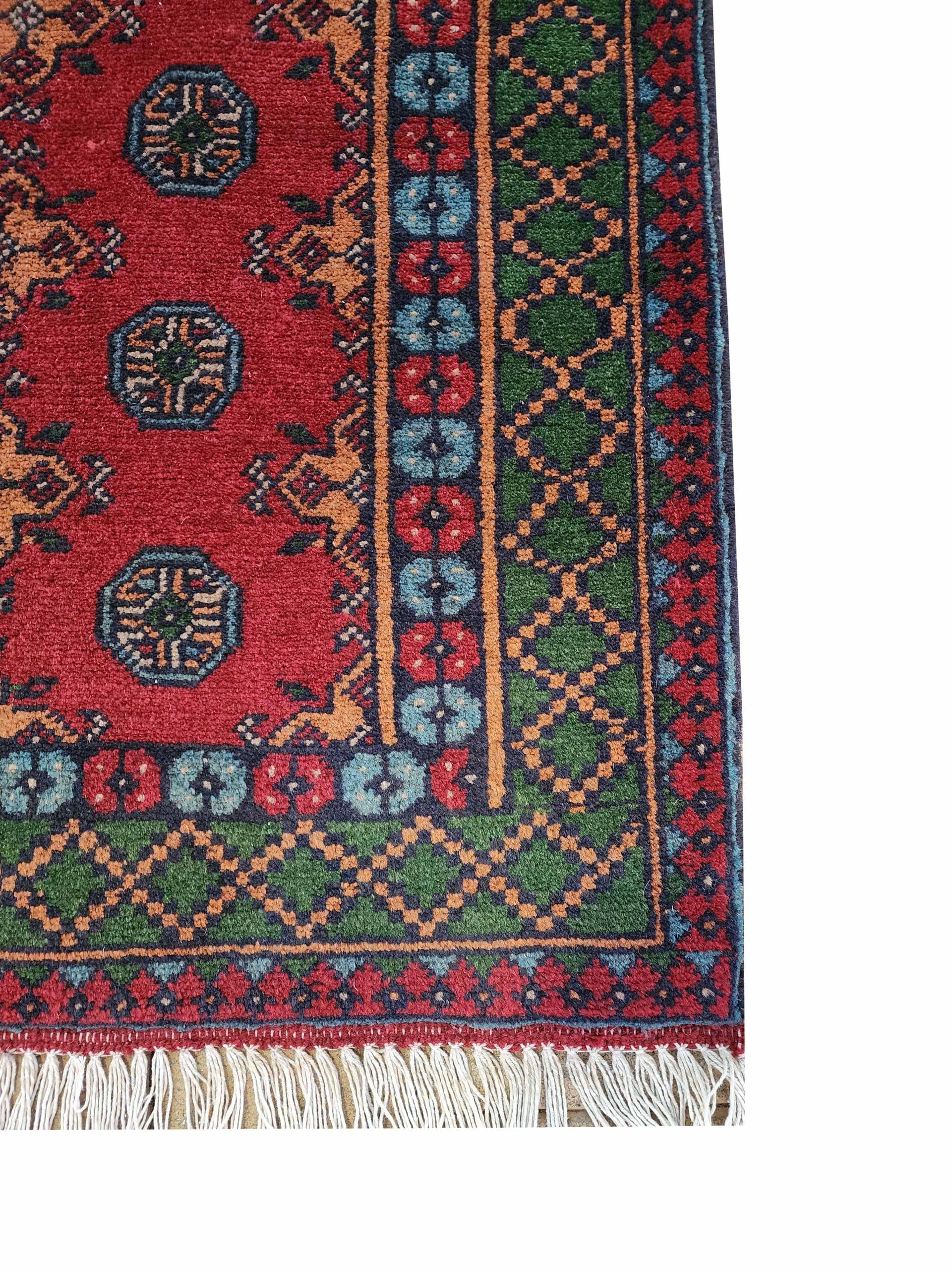 - Red Afghan or Aqcha rugs are simple verision of the Khal Mohammadi rug design. Using locally sourced wool and chemical dyes, the Afghan Reds have a lower knot count than their Khal Mohammadi counterparts and are less introcate as a result. They are woven around the Aq Chah region and between Ankoy and Mazar-i-Sharif in northern Afghanistan. Aqchas are excellent value for money for those looking for a nice handknotted rug that won’t break the bank.Afghan Reds are warm and welcoming. The colours are dark, usually deep reds with dark blue or black used for detail. The detail in the rug can vary but the pattern is almost always one form of repeated columns of ‘gul’ or ‘fil pai’ (elephant prints) adapted from the Ersari and Turkmen weavers’ heritage.