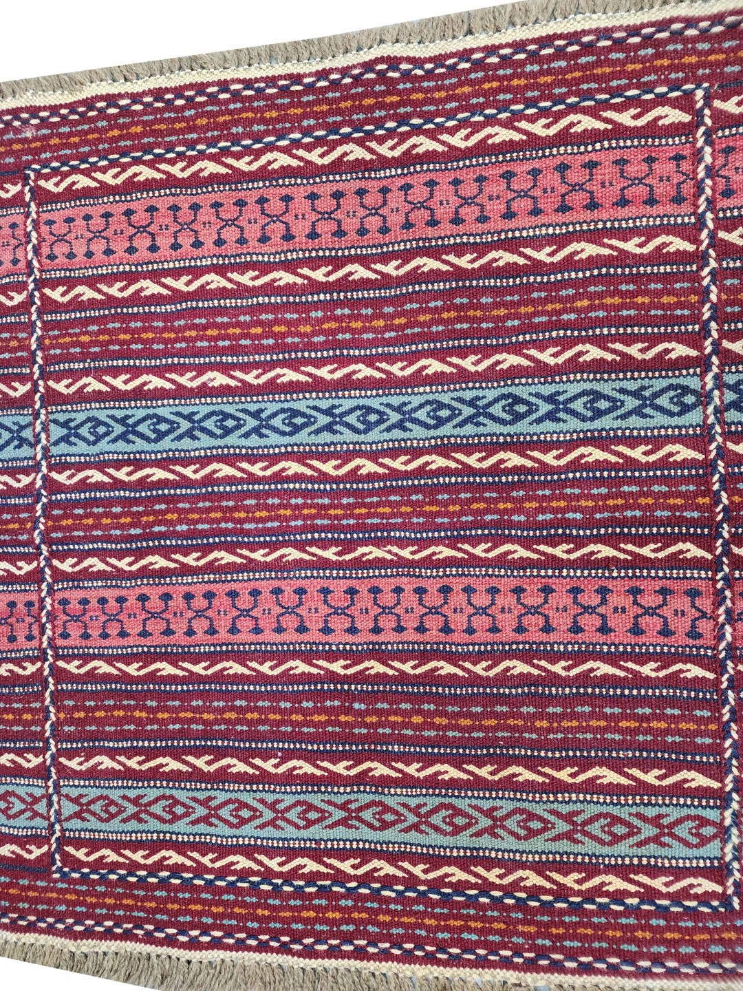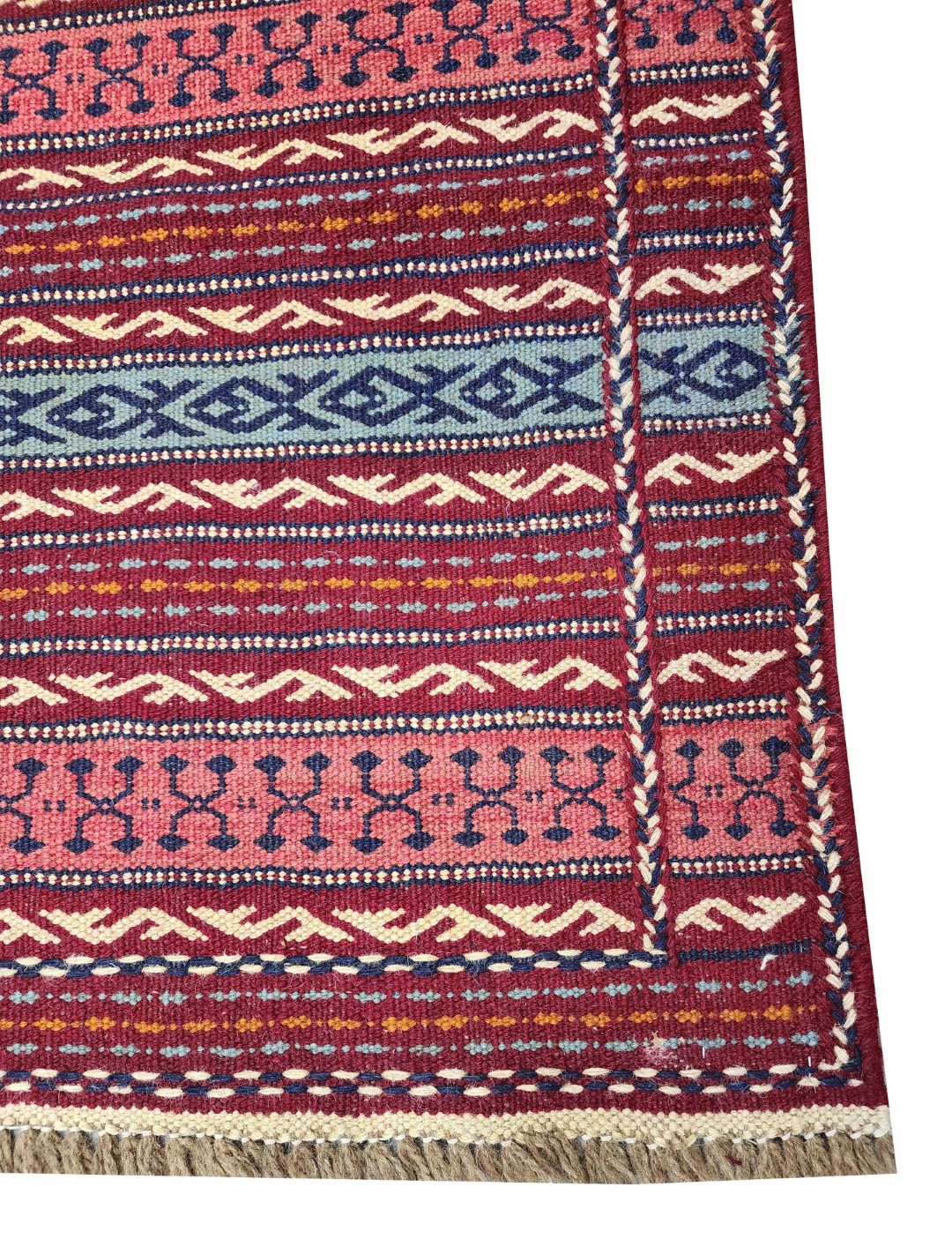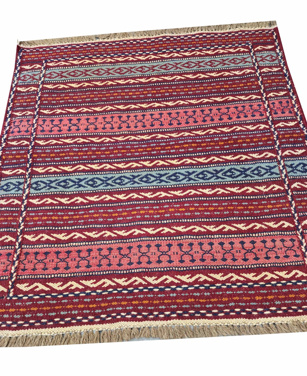 Kalat Kilim is a special art of unique weaving to show greatness to women of Northern Khorasan in eastern Iran. the pattern is like Antolian Kilim.Rural women and nomads create unique designs on carpets depending on their feelings, opinions and mental ideas. Using the method of carpet weaving, weavers create various plant, animal and abstract motifs in the form of simple geometric shapes on the carpet. In kilim weaving, the pattern of the work is usually designed in the form of colorful horizontal lines.