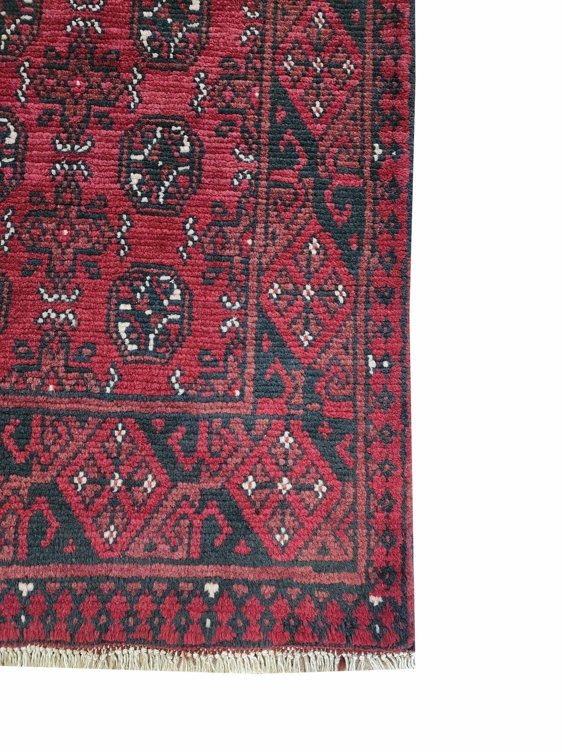 Red Afghan or Aqcha rugs are simple verision of the Khal Mohammadi rug design. Using locally sourced wool and chemical dyes, the Afghan Reds have a lower knot count than their Khal Mohammadi counterparts and are less introcate as a result. They are woven around the Aq Chah region and between Ankoy and Mazar-i-Sharif in northern Afghanistan. Aqchas are excellent value for money for those looking for a nice handknotted rug that won’t break the bank.